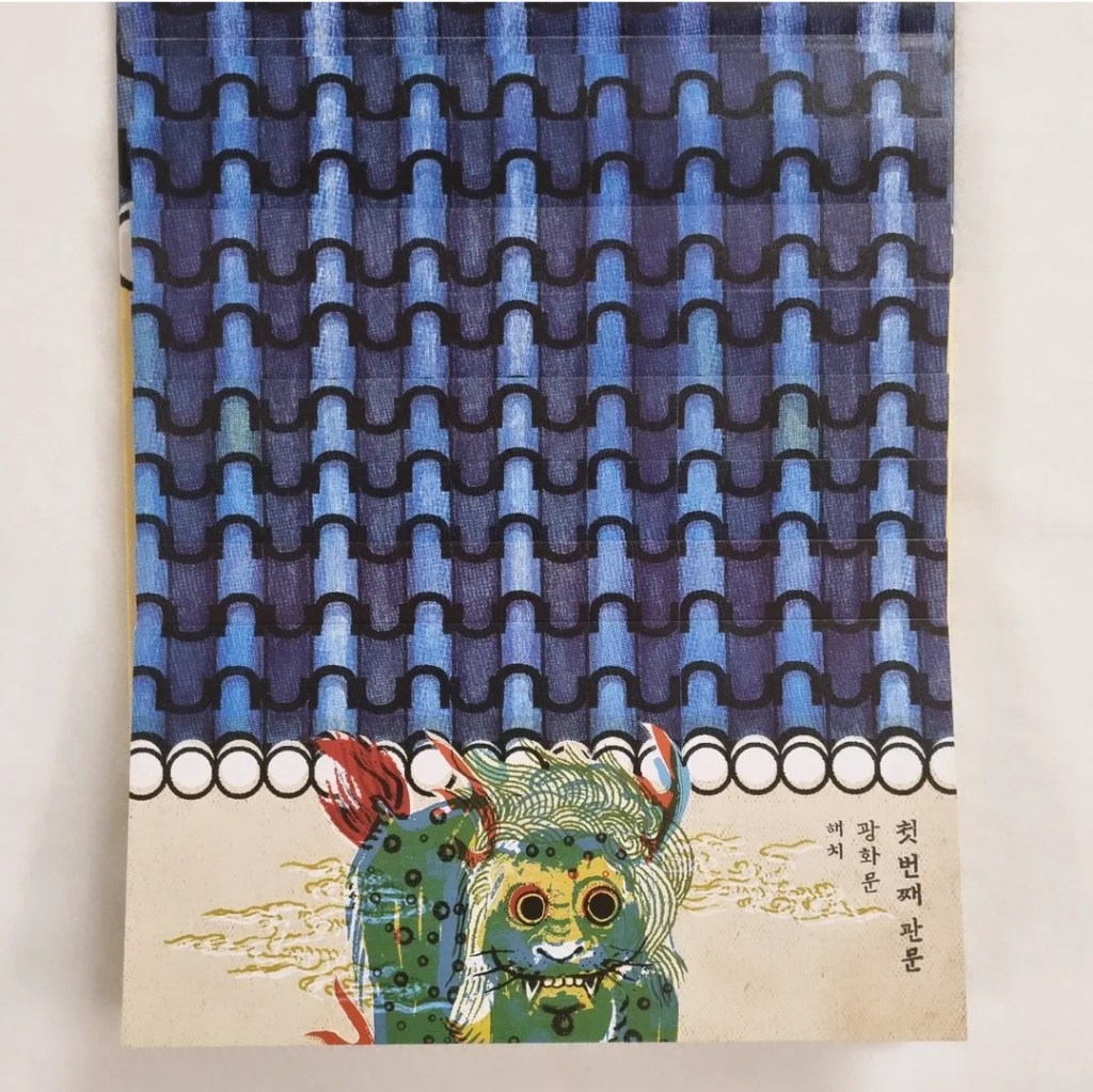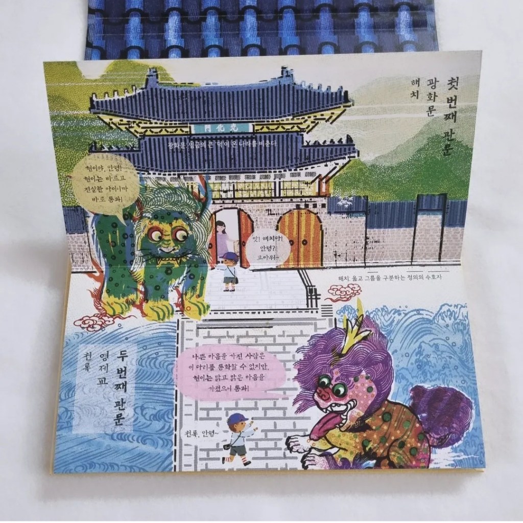 This book is uniquely designed as a panorama-style fold-out picture book. Starting from Gwanghwamun, the story takes readers through Yeongjegyo, Geunjeongjeon, Sajeongjeon, Gyotaejeon, Jagyeongjeon, Gyeonghoeru, and finally to Sinmumun. Along the way, various “Seosu” (auspicious guardian animals) that protect each architectural structure make their appearance.